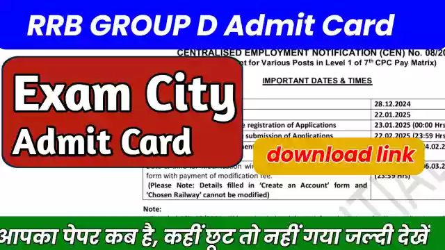 RRB Group D Exam City : ही में रेलवे भर्ती बोर्ड (RRB) ने आरआरबी ग्रुप डी एडमिट कार्ड 2025 जारी कर दिया है। रेलवे ग्रुप D पदों के लिए आवेदन करने वाले और CBT परीक्षा देने वाले उम्मीदवारों के लिए यह महत्वपूर्ण अपडेट है। एडमिट कार्ड अब आधिकारिक वेबसाइट rrbcdg.gov.in सहित सभी रीजनल RRB वेबसाइटों पर उपलब्ध है। उम्मीदवार अपना रजिस्ट्रेशन नंबर और पासवर्ड दर्ज करके एडमिट कार्ड आसानी से डाउनलोड कर सकते हैं। RRB Group D परीक्षा रेलवे भर्ती बोर्ड (RRB) द्वारा आयोजित की जाने वाली एक महत्वपूर्ण प्रतियोगी परीक्षा है, जिसमें लाखों अभ्यर्थी भाग लेते हैं। परीक्षा से पहले उम्मीदवारों के लिए Exam City Intimation Slip और Admit Card दोनों ही बहुत जरूरी दस्तावेज होते हैं।