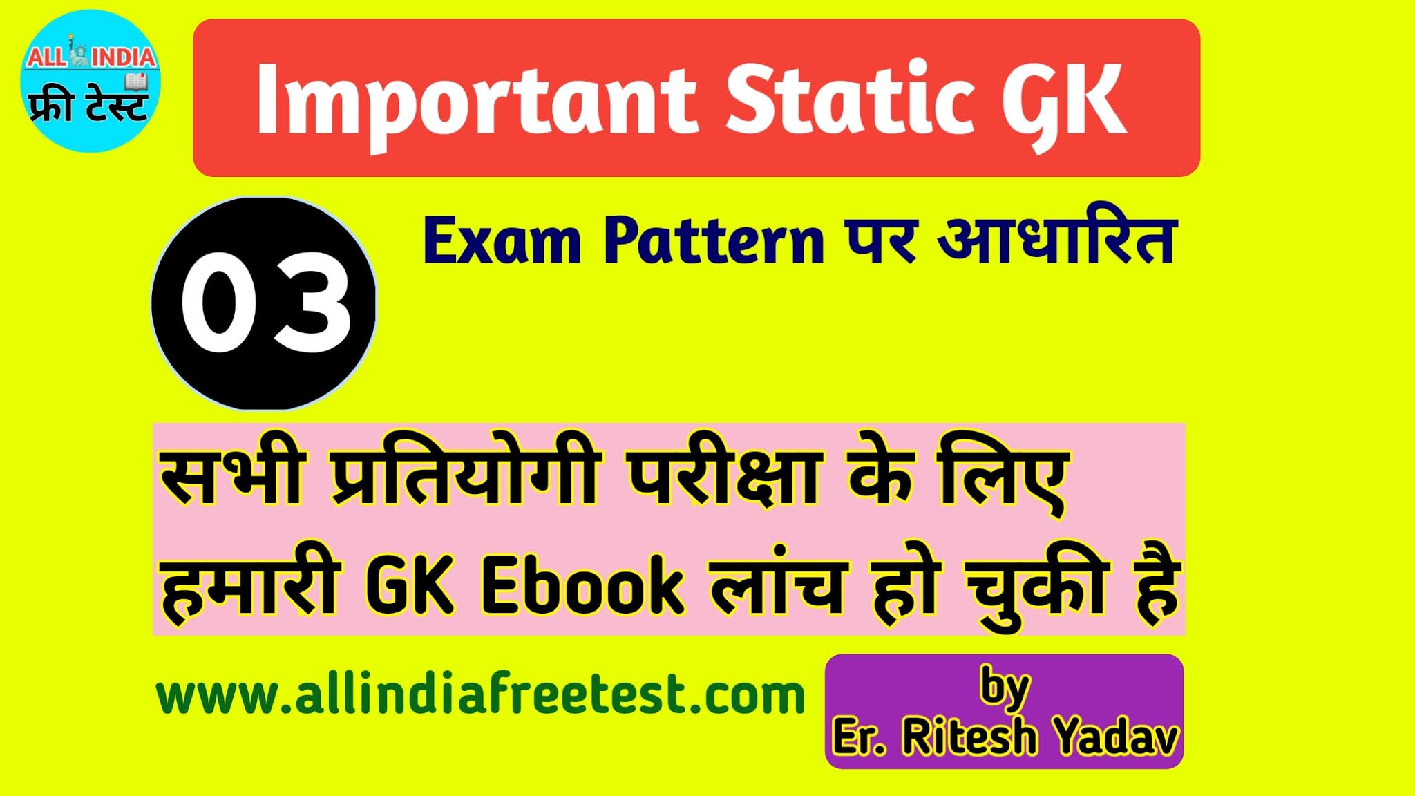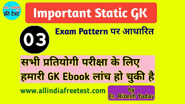 Static GK सभी परीक्षा के दृष्टि कोण से जरूरी है और लगभग सभी परीक्षा में यहां से प्रश्न आते है. Static GK हो या जनरल नॉलेज या परीक्षा में आने वाले GK के सभी प्रश्नों की तैयारी करने के लिए allindiafreetest पर Er. Ritesh Yadav सर और team के द्वारा GK अपडेट किया जाता है जों परीक्षा में पूछे गए प्रश्नों को शामिल करके तैयार करके तैयार किया जाता है यें सभी प्रश्न नए exam पैटर्न पर आधारित होते है जों बोर्ड के निर्धारित टॉपिक पर कराये जाते हैं, निश्चित सफलता के लिए ज़रूर visit करें |